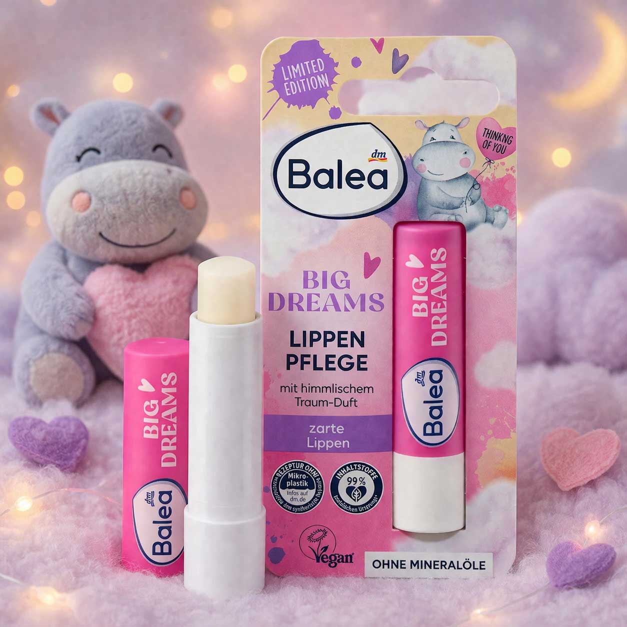 Le baume à lèvres Balea Big Dreams – Édition Limitée prend soin des lèvres tout en les enveloppant d’un parfum doux et rêveur. Sa formule nourrissante hydrate les lèvres sèches et les aide à rester souples, lisses et confortables tout au long de la journée.
