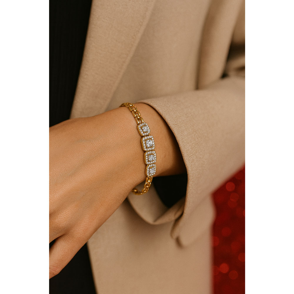 Un bracelet raffiné au design structuré, sublimé par des motifs géométriques sertis d’oxydes de zirconium scintillants. Son éclat luxueux et sa finition dorée apportent une touche de prestige immédiate au poignet, tout en restant élégant et facile à porter au quotidien.