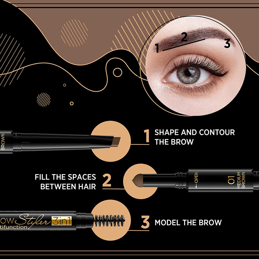 Brow Multifunction Styler 3in1, grâce à une application confortable et à un emballage innovant et compact, vous fera gagner du temps et de l’espace dans une trousse de toilette.