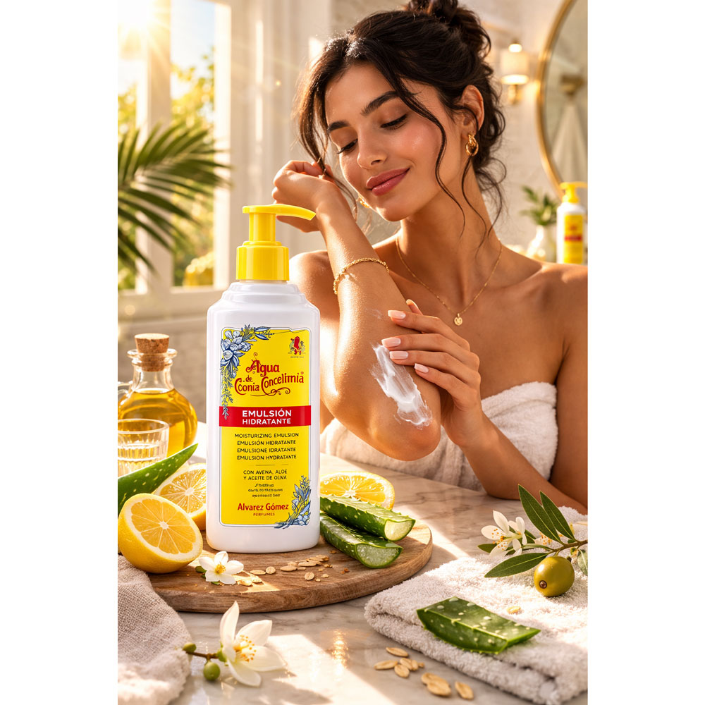 l’Emulsión Hidratante “Agua de Colonia Concentrada” de la marque Alvarez Gómez. C’est une émulsion hydratante pour le corps, parfumée avec la fragrance classique concentrée de la maison.