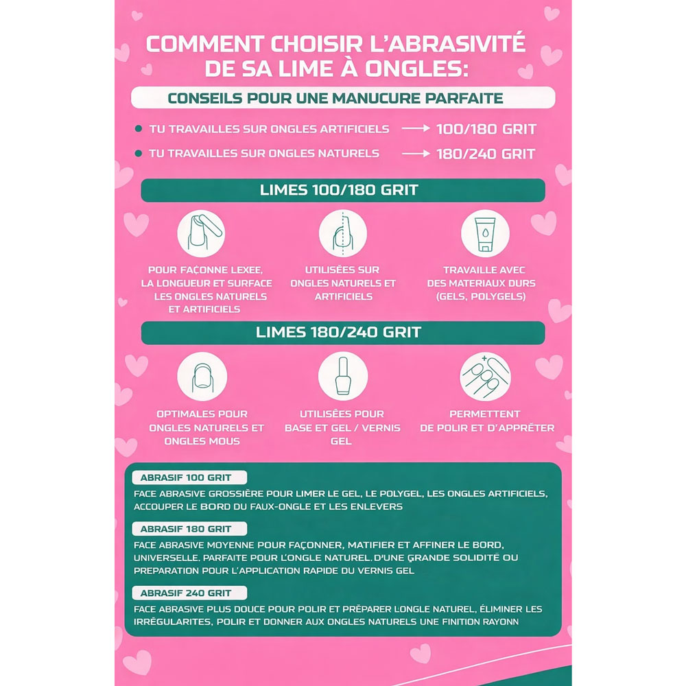 Grâce à ses deux faces d’abrasivité différente, elle permet à la fois de réduire la longueur, façonner la forme et préparer l’ongle avant la pose de gel ou de vernis semi-permanent.