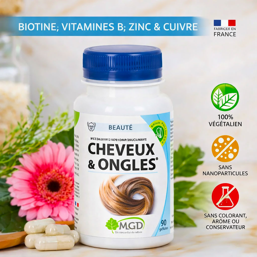 MGD Cheveux & Ongles est un complément alimentaire spécialement formulé pour contribuer à la beauté et à la vitalité des cheveux et des ongles. Sa formule associe biotine, vitamines du groupe B, zinc et cuivre, des nutriments essentiels reconnus pour leur rôle dans le maintien de cheveux forts et d’ongles résistants.
